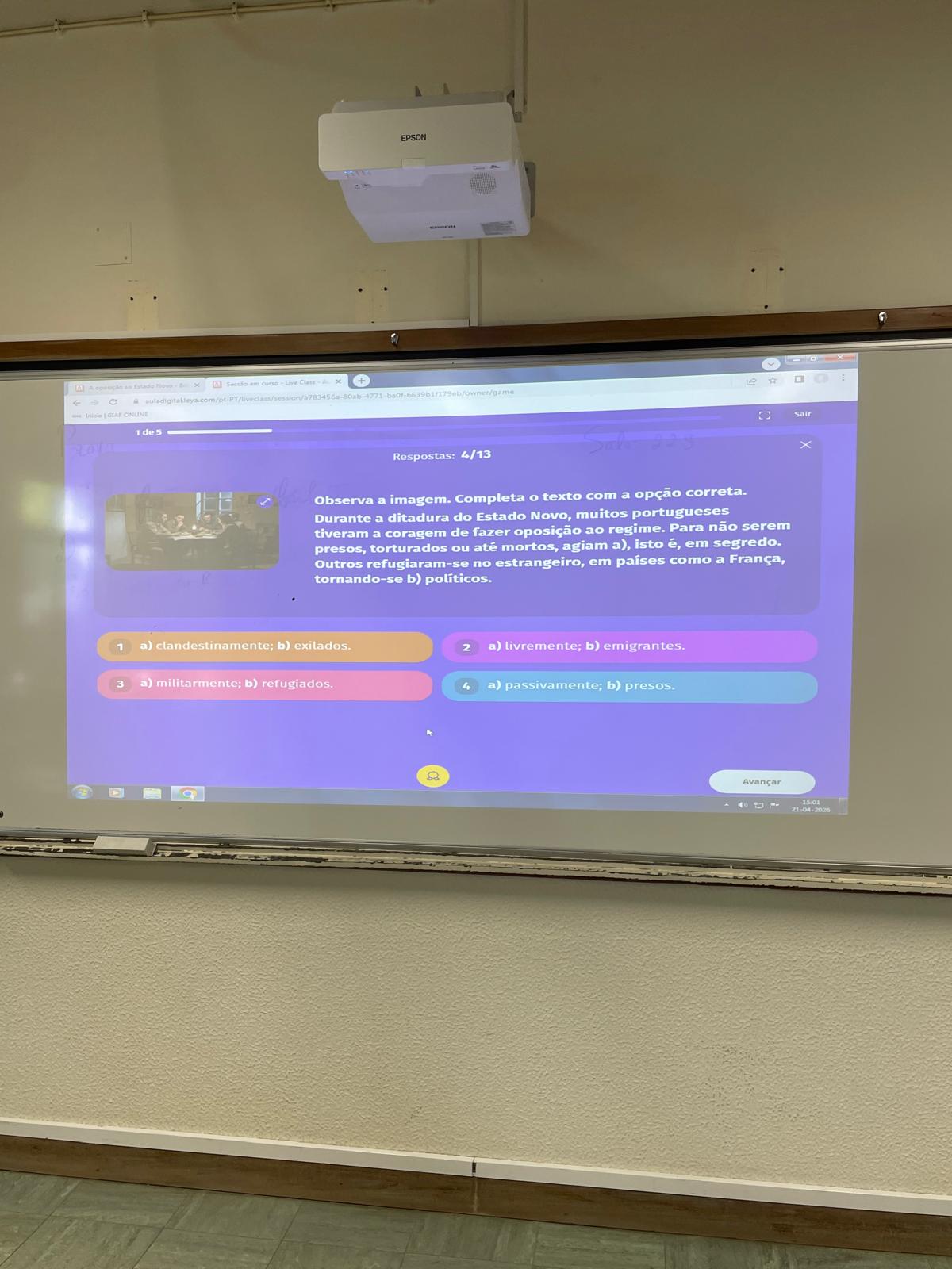 Esta atividade contou com a presença e orientação da professora da disciplina, Lisete Monteiro, e, ainda, com a Delegada Escolar da Editora Leya, que trouxe propostas inovadoras para complementar o nosso manual escolar. Entre perguntas e respostas, reforçámos conhecimentos e celebrámos a Liberdade com a ajuda das ferramentas digitais.