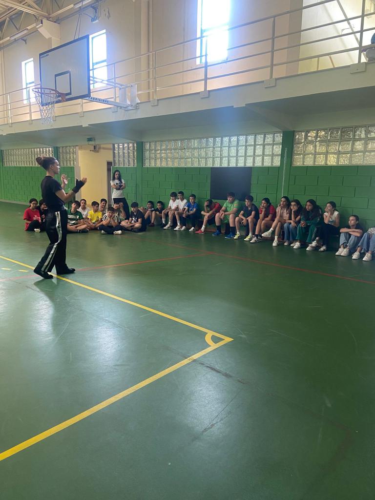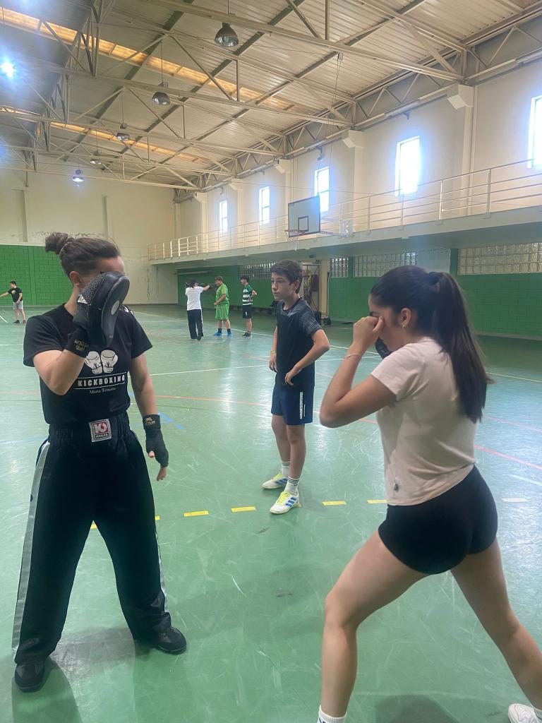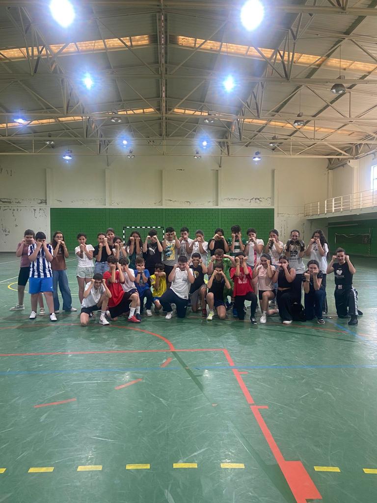 Realizou-se uma atividade de Kickboxing com os alunos do 7.º ano, no âmbito das disciplinas de Educação Física e História. Durante a sessão, os alunos aprenderam movimentos básicos como a posição de guarda, socos e pontapés, sempre com foco na segurança, respeito e controlo. A atividade teve como objetivos promover a coordenação motora, a disciplina e o gosto pela prática desportiva. Os alunos participaram com entusiasmo, demonstrando interesse e espírito de equipa ao longo de toda a aula.