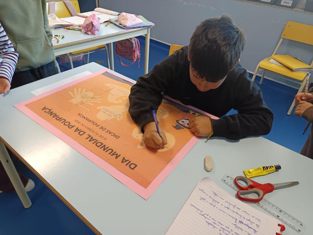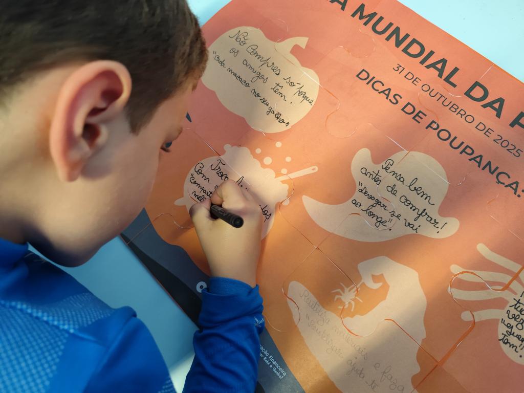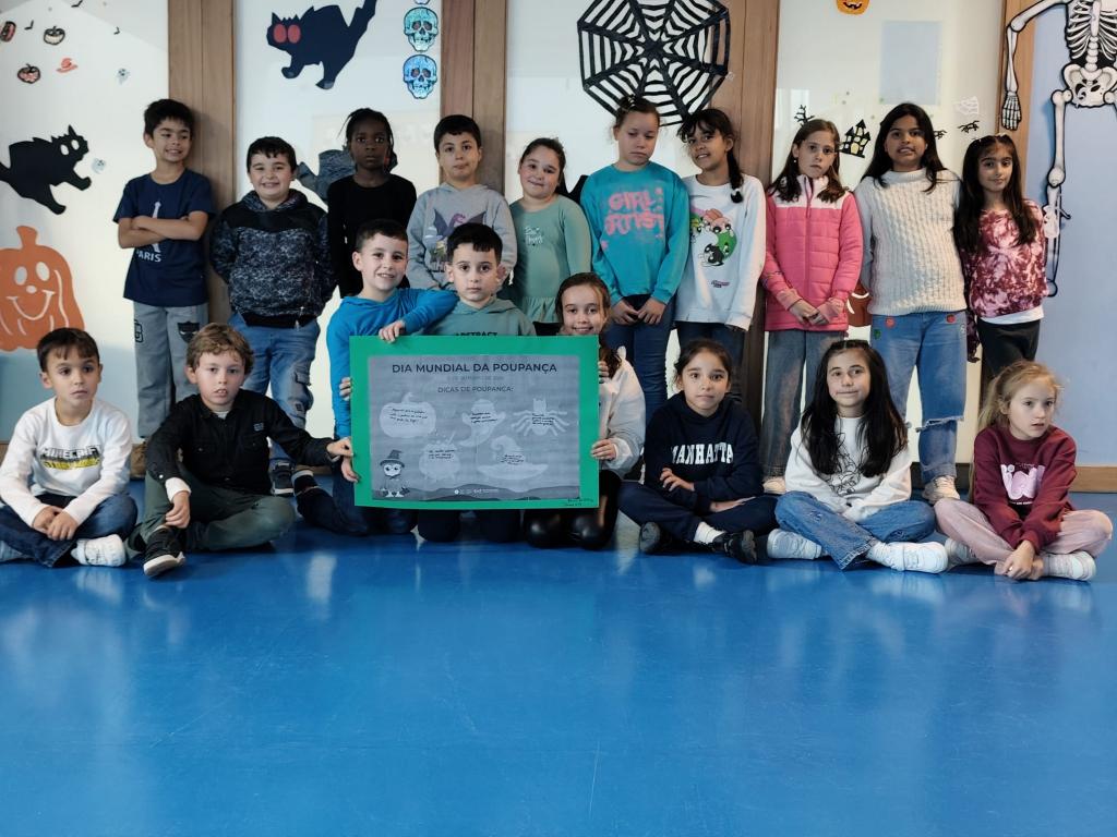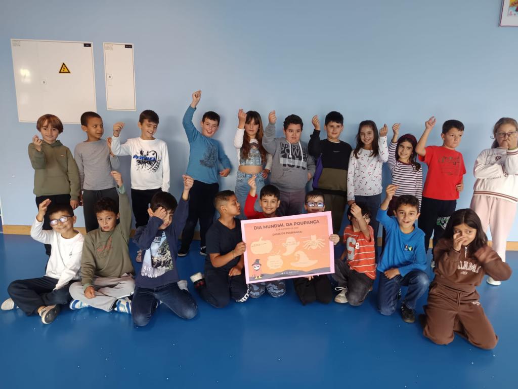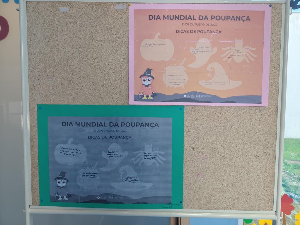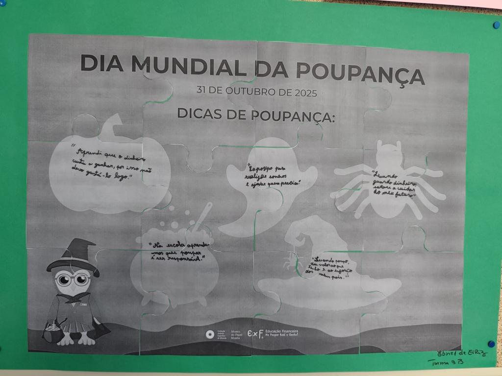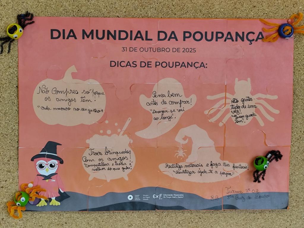 No âmbito do Projeto de Educação Financeira “No poupar está o ganho!”, os alunos das turmas do 3º ano, da EB1 de Eiriz e da turma T3º02 de Santa Cruz do Douro, realizaram no dia 31 de outubro, o primeiro desafio. Nesta data comemora-se o Dia Mundial da Poupança. Os alunos participaram numa atividade especial, dedicada à importância de poupar e usar o dinheiro de forma responsável.  Construíram um cartaz através da montagem de um puzzle, e de seguida, escreveram várias dicas de poupança para lembrar a toda a escola, que poupar é um hábito importante e divertido!
