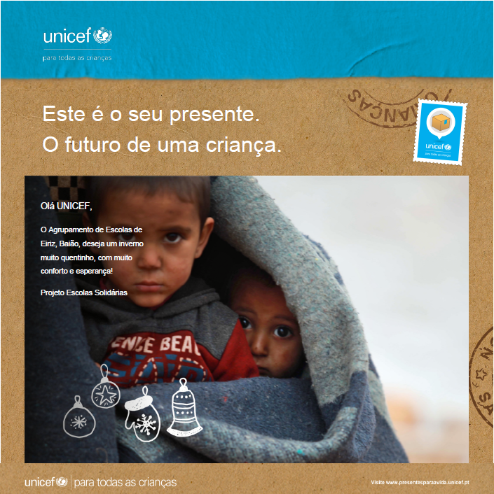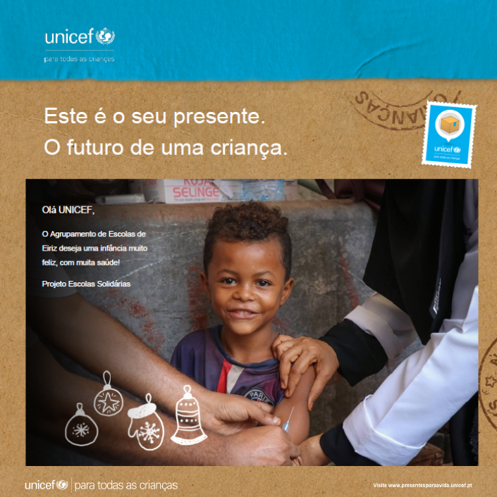 Mais uma vez o Projeto Escola Solidária, quer agradecer à comunidade educativa, tanto pela doação dos bens como na compra dos mesmos. Pois, com o valor arrecadado na banca exposta na Feira Franca do passado dia 12, foram adquiridos os seguintes bens na UNICEF, intitulados “Presentes para a vida”: