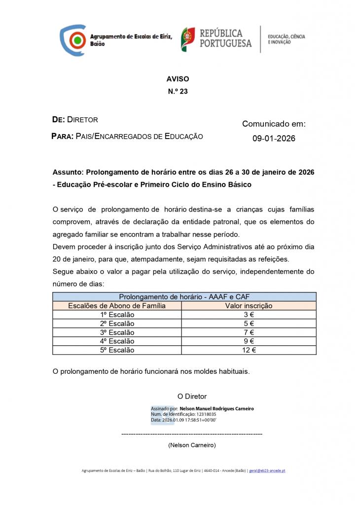 09/01/2026 Prolongamento de horário entre os dias 26 a 30 de janeiro de 2026 Por escola_help em Avisos Educação Pré-escolar e Primeiro Ciclo do Ensino Básico Ficha de inscrição para a AAAF _CAF 2025_2026 – Interrupção final do 1.º semestreDescarregar
