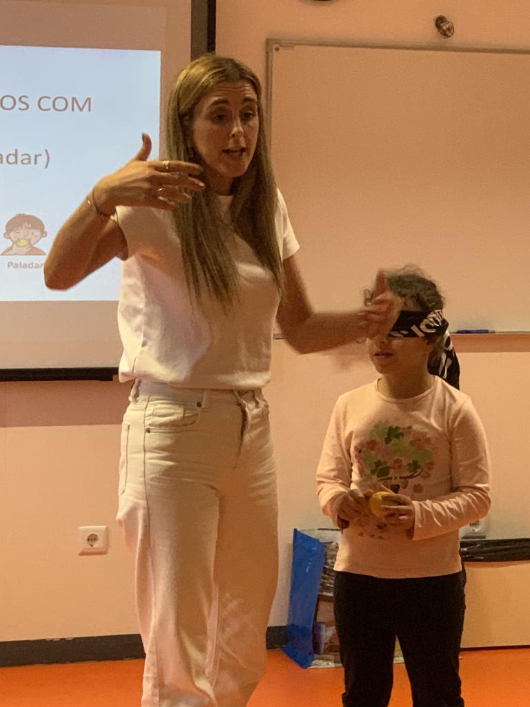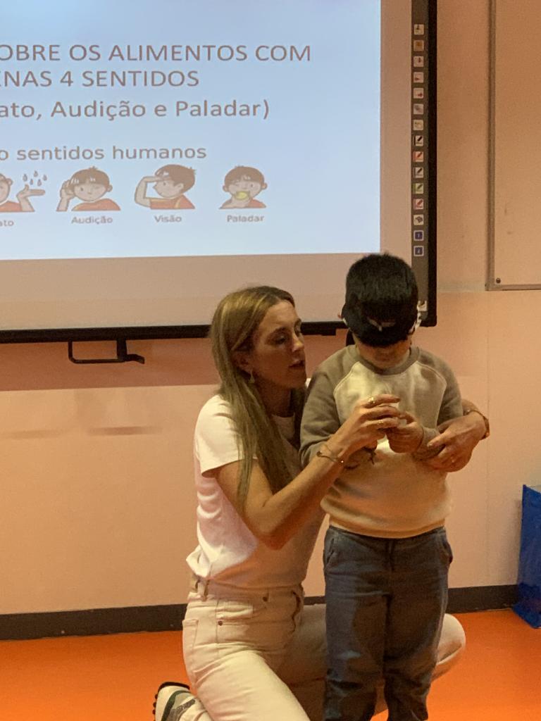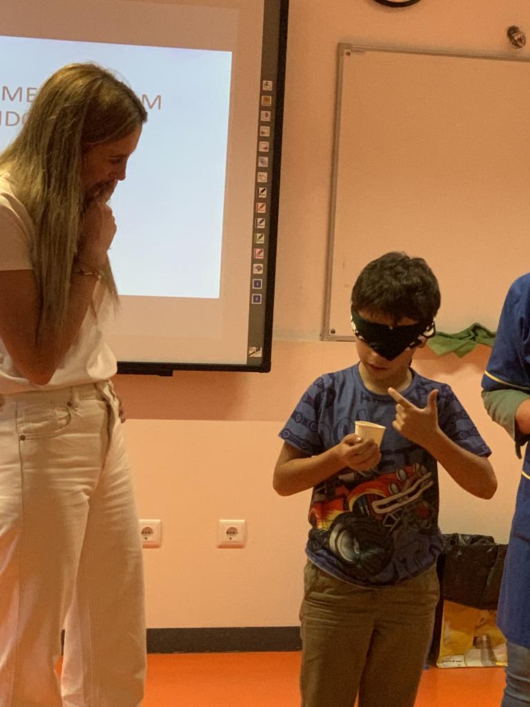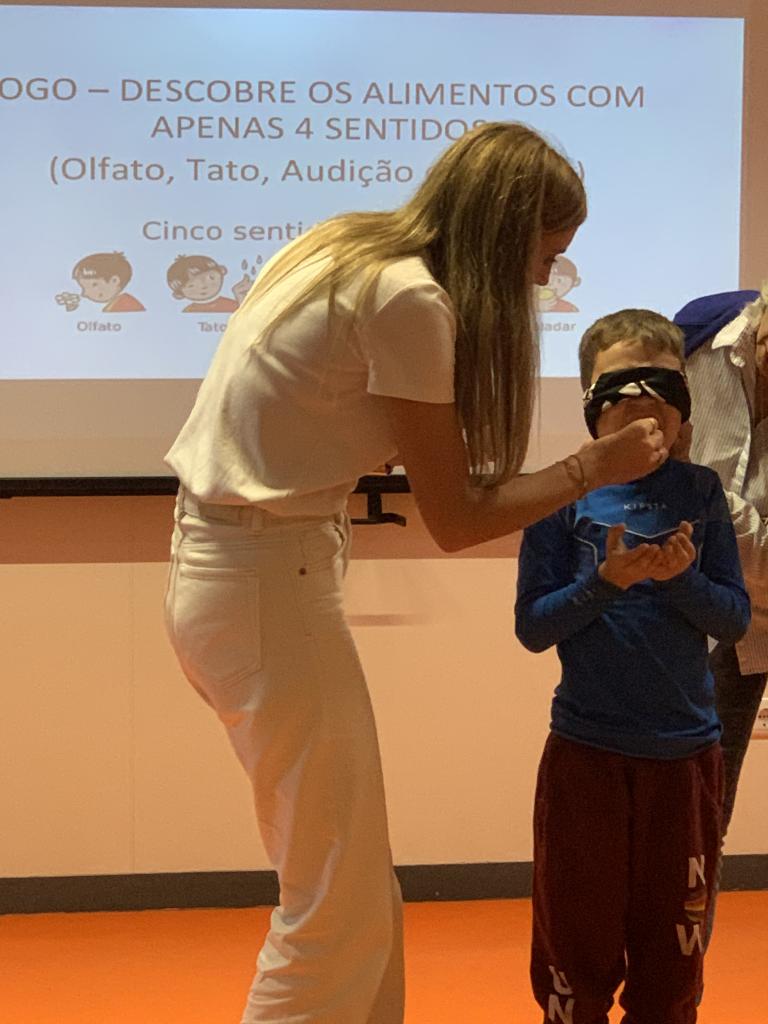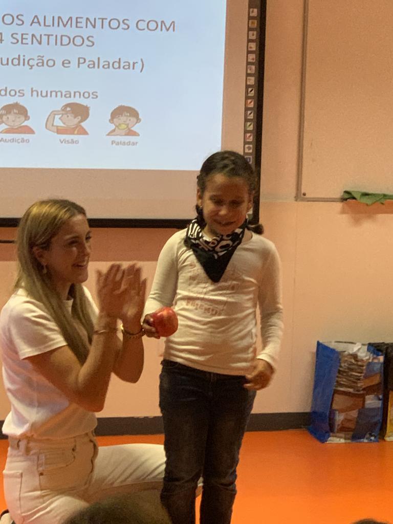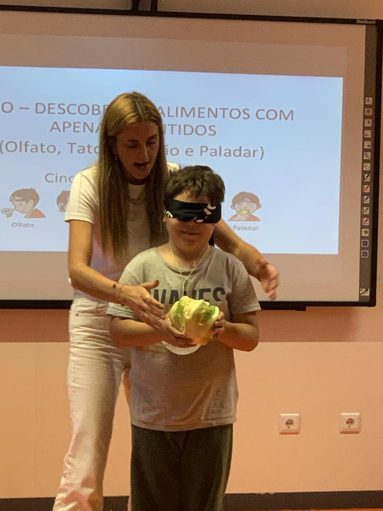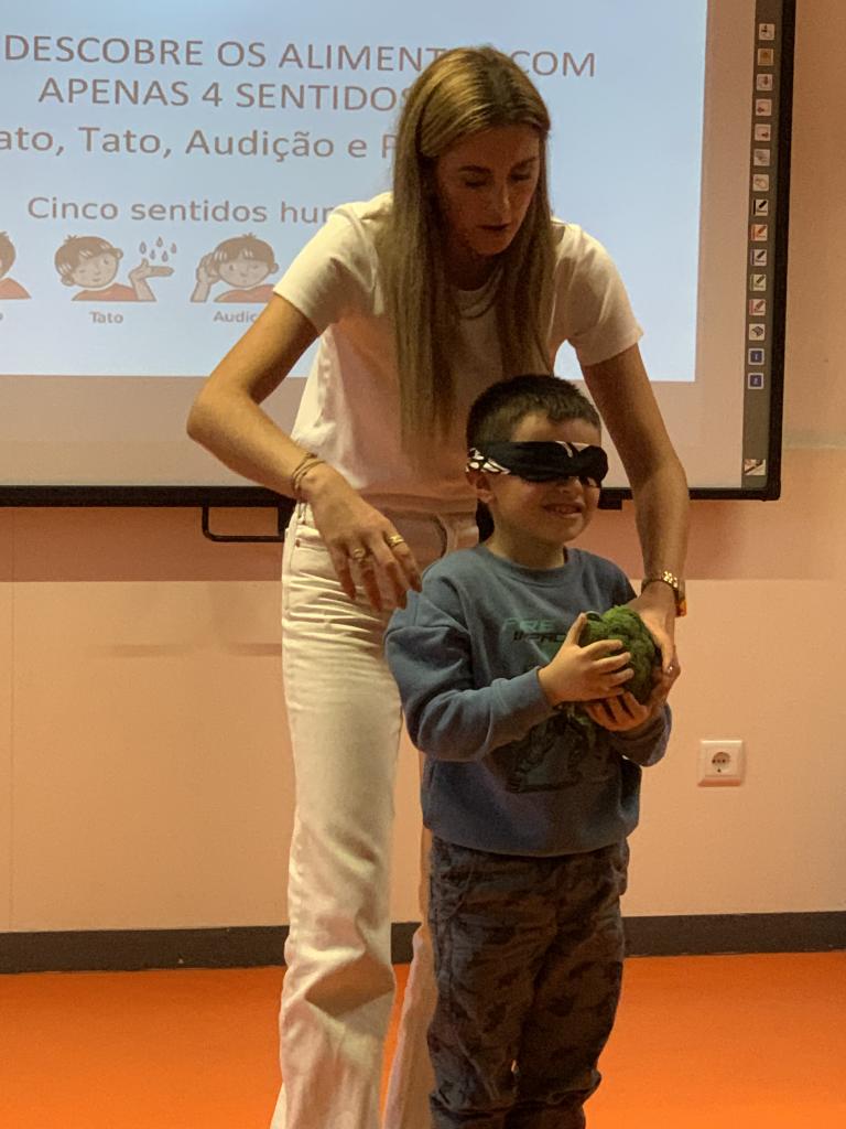 Para tornar a experiência ainda mais envolvente, participaram num jogo sensorial onde, com os olhos tapados, puderam cheirar, tocar e provar alimentos de vários grupos, tentando adivinhar de que alimento se tratava. Esta atividade despertou a curiosidade e os sentidos dos alunos, promovendo o contacto com novos sabores e texturas.