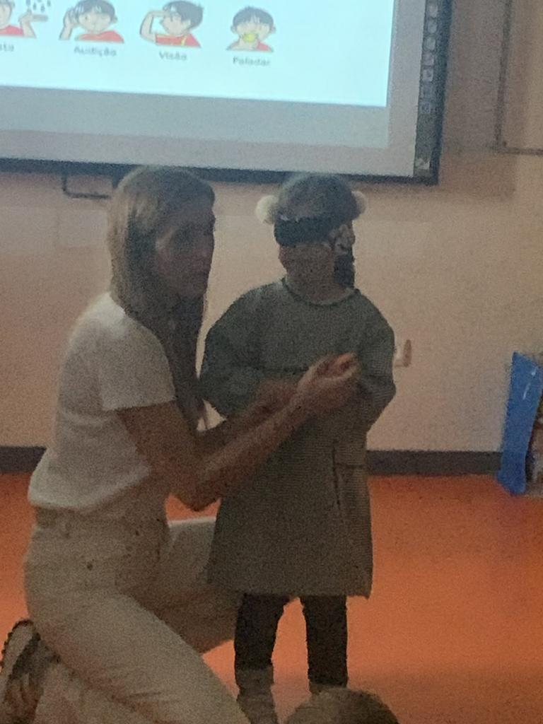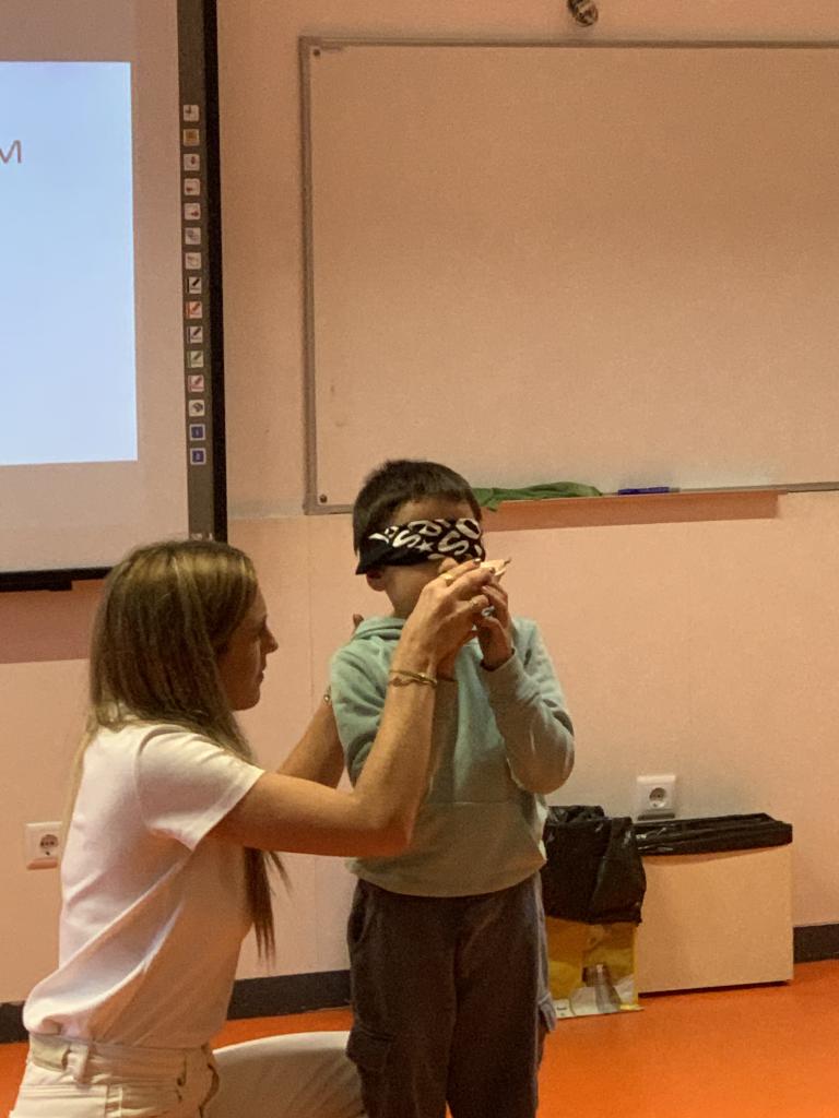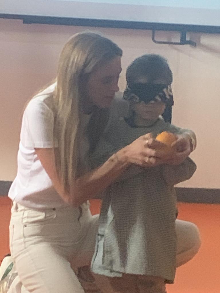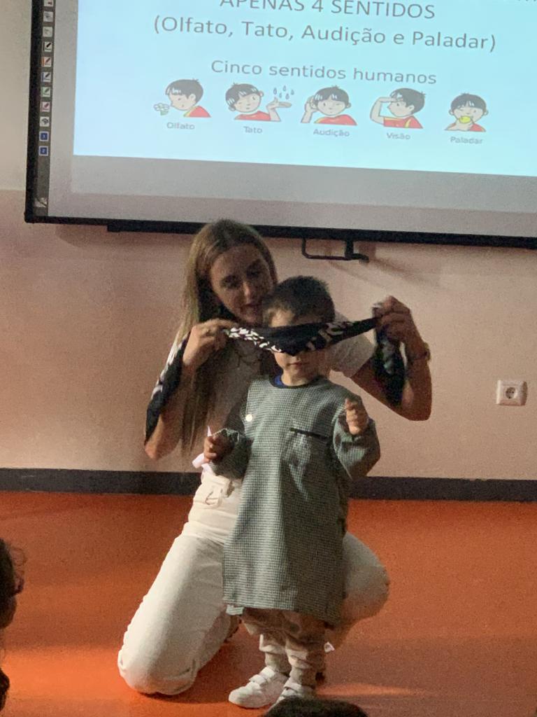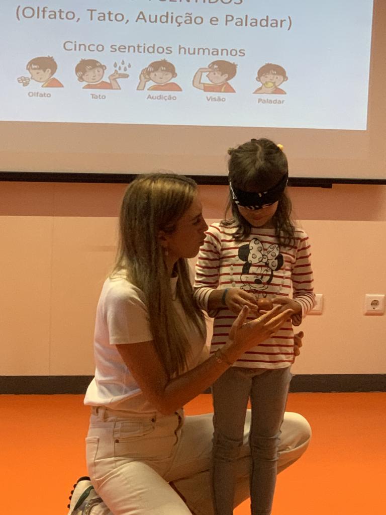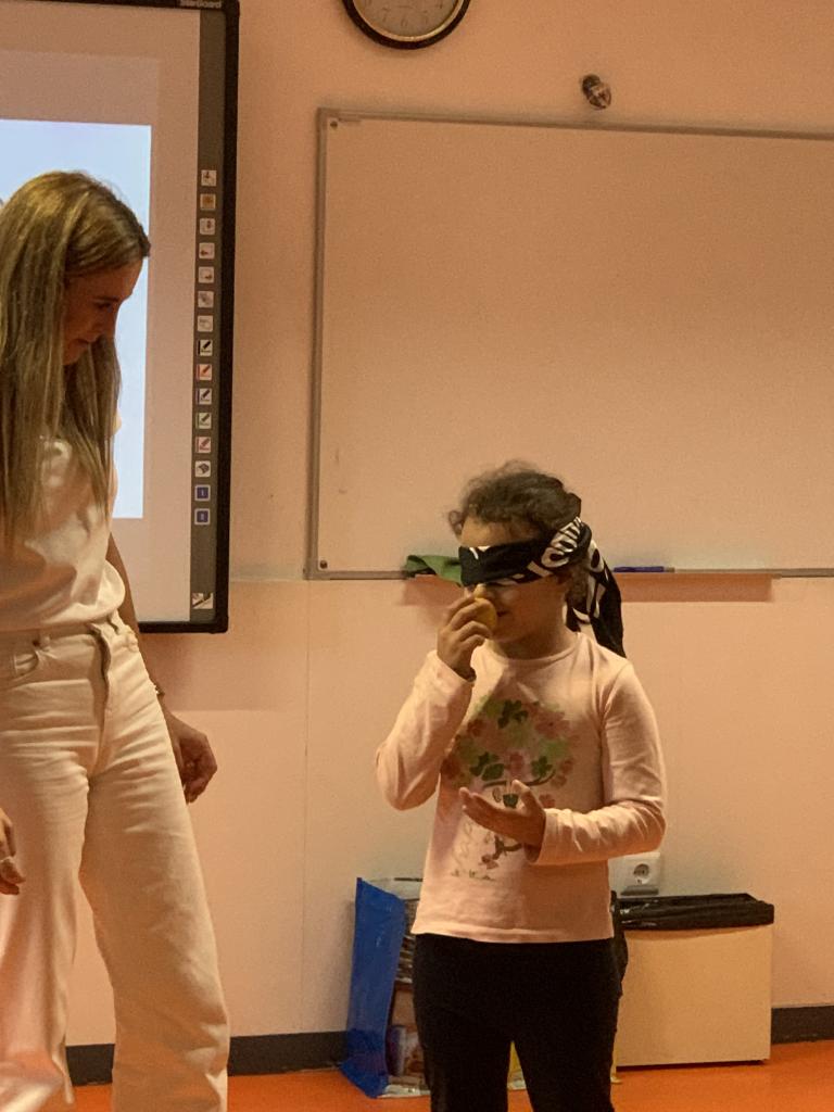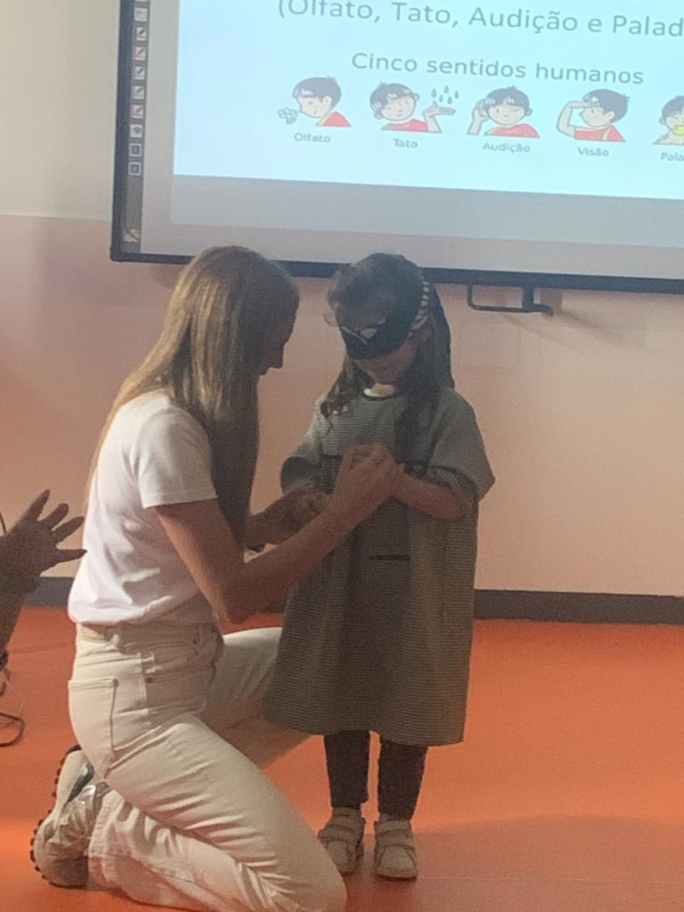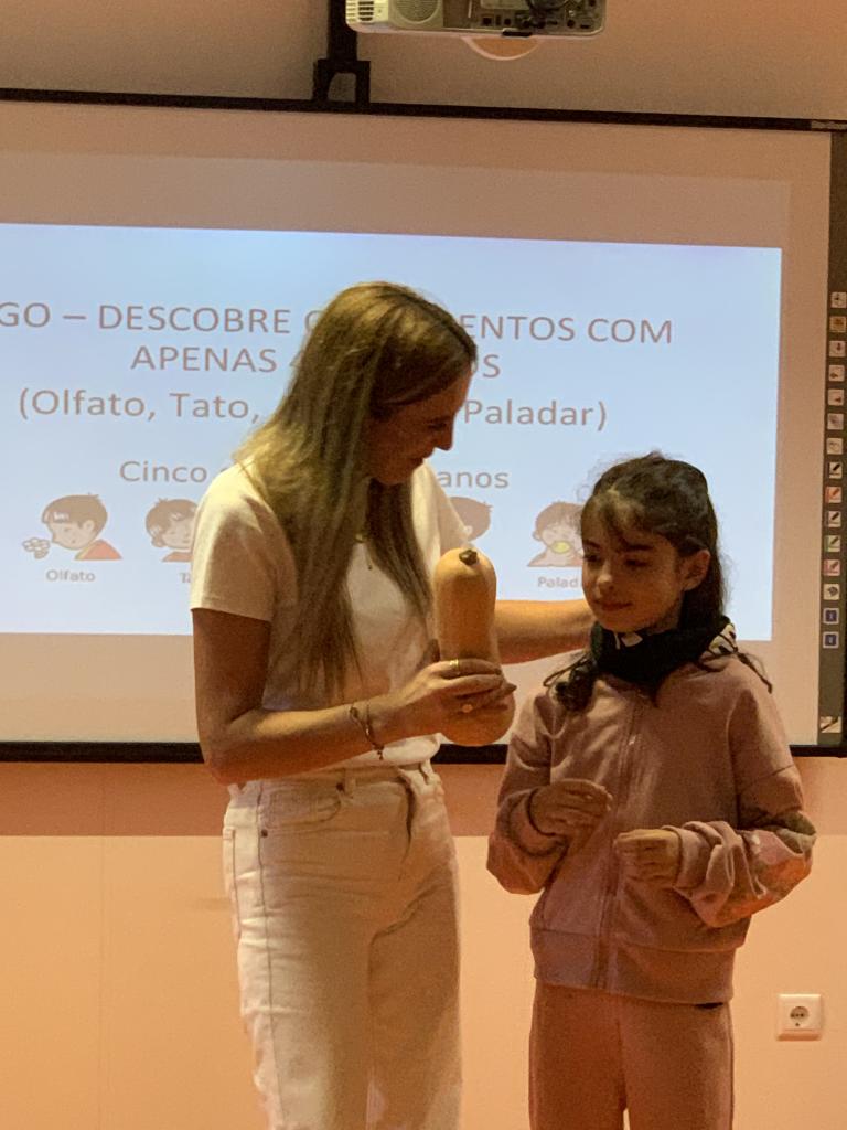 Para tornar a experiência ainda mais envolvente, participaram num jogo sensorial onde, com os olhos tapados, puderam cheirar, tocar e provar alimentos de vários grupos, tentando adivinhar de que alimento se tratava. Esta atividade despertou a curiosidade e os sentidos dos alunos, promovendo o contacto com novos sabores e texturas.
